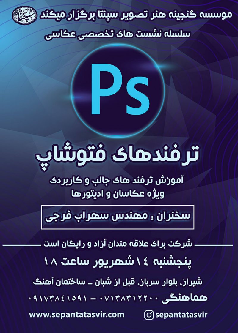 نشست این هفته موسسه “گنجینه هنر تصویر سپنتا” که روز پنج شنبه 14 شهریورماه ساعت 18.00 توسط مهندس “سهراب فرجی” ارائه می شود، شامل ارائه راهکارها و ترفندهایی است که موجب می شود عکاسی را با لذت و قدرت بیشتری انجام دهیم و از امکانات و قابلیت های آن در جهت ایجاد خلاقیت و افزایش مهارت استفاده کنیم.
