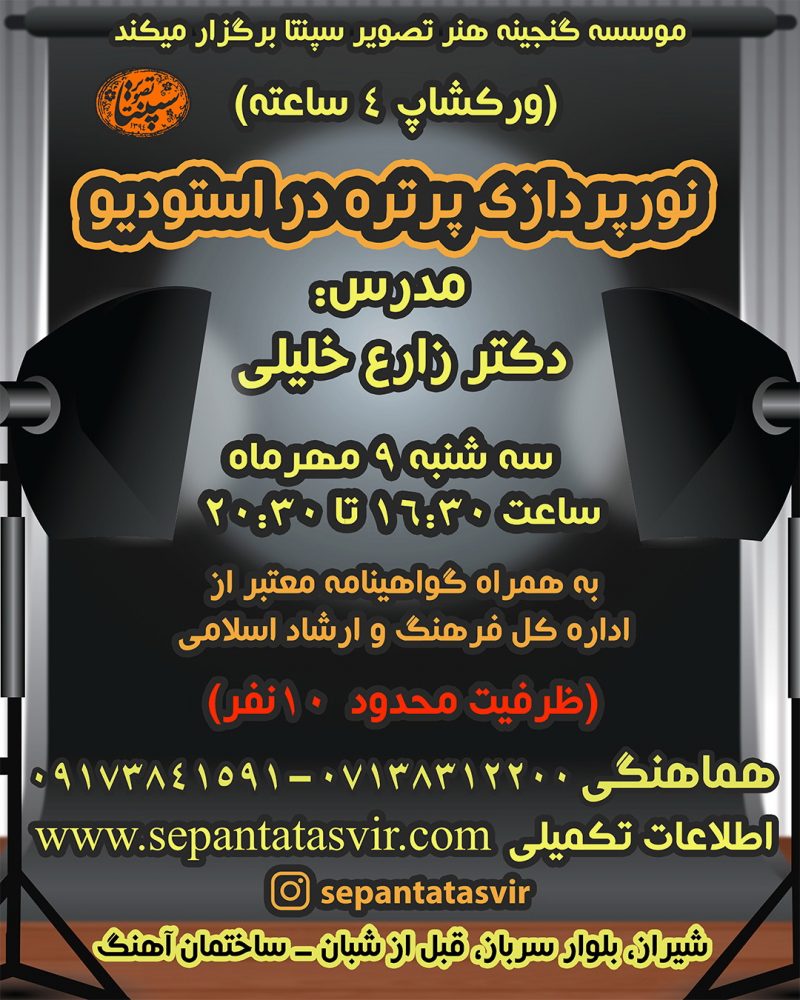 کارگاه آموزشی نورپردازی پرتره در استودیو این هفته در استودیوی موسسه گنجینه هنر تصویر سپنتا برگزار می گردد.